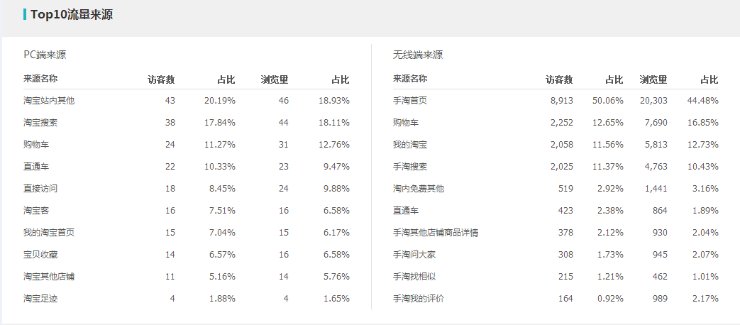 我们可以在这里点击商品后面的查看详情。这里我们是可以看到他的这个宝贝的流量来源。而我们重点,可以去关注一下他的流量来源是什么占比较高。所以这里不管是pc端的流量来源还是无线端的流量来源,我们都是要去重点关注的。